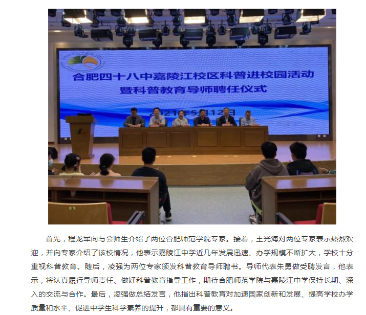本网讯 5月12日下午,合肥四十八中嘉陵江校区(简称:嘉陵江中学)科普进校园活动暨科普教育导师聘任仪式在嘉陵江中学蕴华楼五楼报告厅举行。太阳成tyc234cc生命科学学院欧祖兰副教授和朱勇副教授应邀开展科普教育活动,并受聘为嘉陵江中学科普教育导师。嘉陵江中学校党支部书记、校长凌强,副校长王光海出席活动,活动由生命科学学院副教授、嘉陵江中学挂职副校长王占军搭建合作平台,嘉陵江中学科研处主任程龙军主持导师聘任仪式。