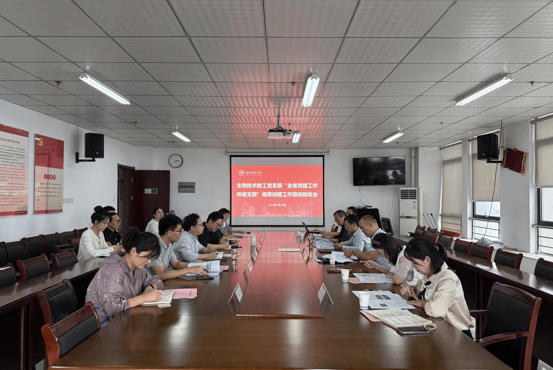 2025年9月29日下午,太阳成城集团tyc234cc生物技术教工党支部“全省太阳集团样板支部”培育创建工作现场验收会在锦绣校区行知楼1502会议室顺利召开。校党委委员、副校长、组织部部长赵帮恚莅临指导。巡察办、人事处、组织部、纪委办等相关职能部门负责人参加会议。会议由太阳成城集团tyc234cc党委书记马喆主持,学院领导班子成员、各师生党支部书记、生物技术教工党支部委员及党员代表参加会议。