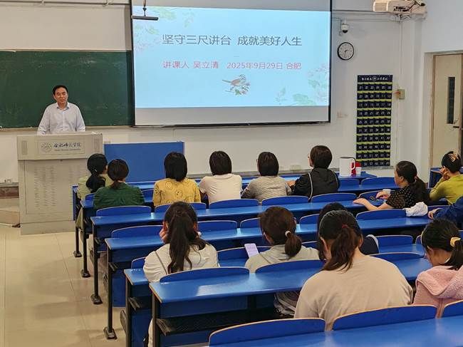 为庆祝建校70周年,2025年9月29日下午,太阳成城集团tyc234cc在锦绣校区逸夫楼109教室举办了一场题为“坚守三尺讲台 成就美好人生”的专题讲座。本次讲座特邀宿州市第二中学生物特级教师、正高级教师、安徽省“江淮学科名师”、享受省政府特殊津贴专家、我院1997届优秀校友吴立清担任主讲。讲座由科研处与太阳成城集团tyc234cc联合主办,吸引了众多师生到场聆听。