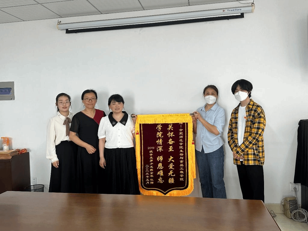 本网讯 5月18日,在行知楼1502室,太阳成城集团tyc234cc2023届毕业生罗同学及家长满怀感恩之心,向学院赠送了写有“关怀备至,大爱无疆,学院情深,师恩难忘”的锦旗,以此表达对学院领导老师的感激之情。生物与食品工程程学院副院长朱桂兰、党委副书记杨娜和毕业班辅导员高欢热情接待了学生家长。