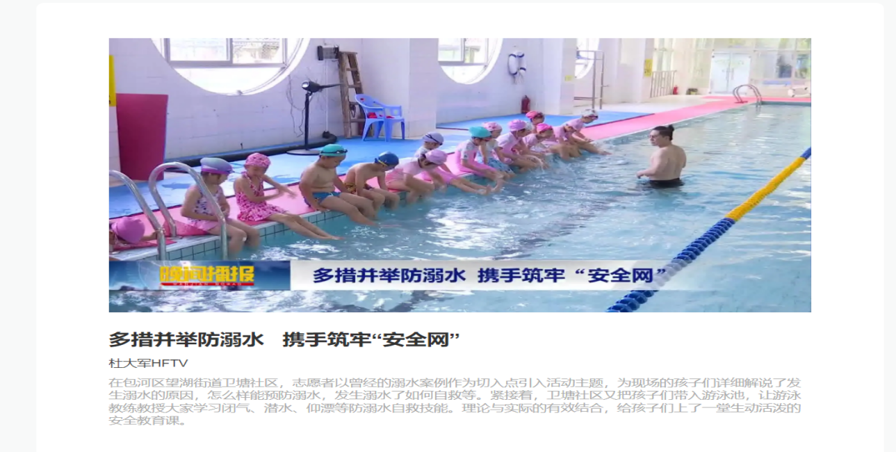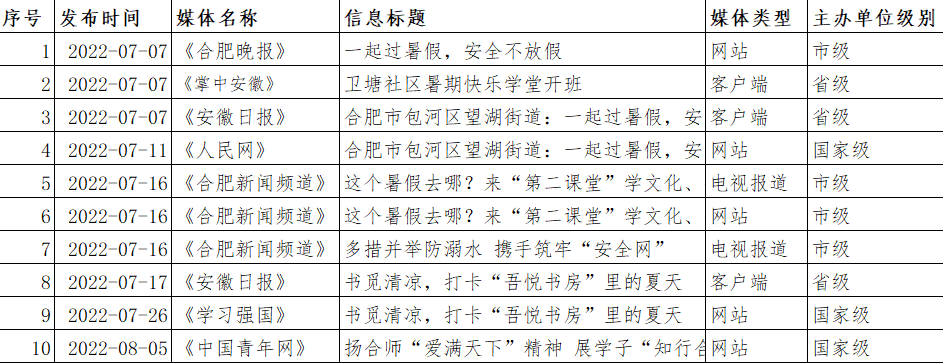 《学习强国》、《人民网》、《中国青年网》等国家级媒体相继报道学堂的开设情况,《安徽日报》、《掌中安徽》、《合肥晚报》等媒体报道了学堂日常生活情况。“喜迎二十大”爱国教育和暑期防溺水主题教育经合肥电视台进行采访,并于《晚间播报》、《早安合肥》等新闻频道、腾讯视频平台进行播放。此外,微信公众平台《美望湖》、《合师生科》也对学堂进行了宣传报道,该学堂共被各家媒体报道14次。