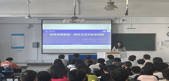 安徽安科生物工程(集团)股份有限公司基因药物工程研究中心副主任魏利承担《基因工程》一课。魏老师以《抗体药物研发——纯化工艺开发及控制》为题,向大家讲授抗体药物的制备工艺。她首先阐述抗体药物是一种治疗疾病的新型药物,它可以从患者体内提取免疫细胞,并对之进行培养和扩增,然后将其回输到患者体内,从而发挥治疗作用。接着又从抗体药物制备工艺流程、抗体药物下游纯化工艺开发及控制加工,为同学们立体地展示了抗体药物的研发历程。