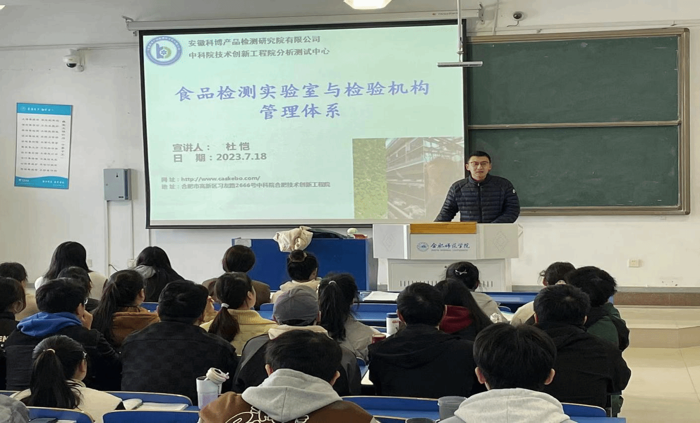 学院邀请安徽科博产品检测研究院有限公司工程师杜恺,围绕“食品检测实验室与检验机构管理”专题进行了讲解,主要包括实验室管理理念与依据,实验室有关法律法规与规范性文件,实验室认可与检验检测机构资格认定等部分,在讲解过程中采取了三聚氰胺、砒霜门等案例进行了分析,深入浅出的对食品企业中实验室管理进行了讲授。同时,杜老师还结合今年正在科博检测研究院实习的学生实习情况与同学们进行了交流。