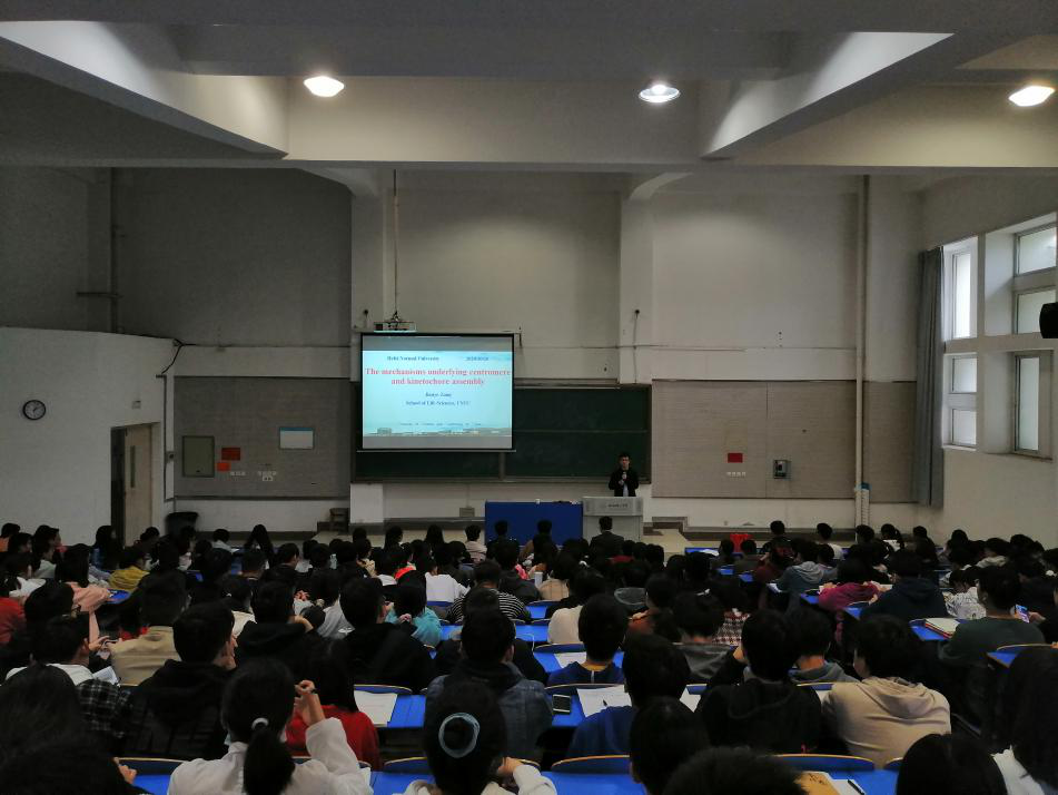 本网讯 10月26日下午14点,应生命科学学院邀请,中国科学技术大学生命科学与医学部副部长、生命科学学院执行院长、中国科学院“百人计划”、生命科学学院教授、博士生导师臧建业在逸夫楼西阶二教室,为生科院师生作了题为“The mechanisms underlying centromere and kinetochore assembly”的学术报告,生科院师生近300人齐聚一堂聆听了报告,报告由生命科学学院院长徐忠东教授主持。