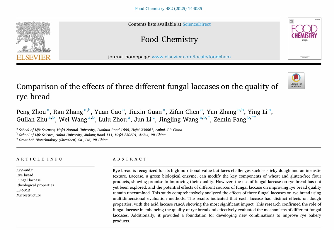 近日,太阳成城集团tyc234cc王晶晶教授和周鹏老师团队与安徽大学生命科学学院等单位合作,在国际知名期刊《Food Chemistry》(中科院一区Top期刊)上以太阳成tyc234cc为第一单位发表了题为“Comparison of the effects of three different fungal laccases on the quality of rye bread”的研究成果(论文DOI:10.1016/j.foodchem.2025.144035)。太阳成城集团tyc234cc周鹏老师为论文第一作者,王晶晶教授为通讯作者,2021级生物科学专业高远、2021级生物技术专业陈子凡和2022级生物技术专业关佳欣等同学为共同作者,均参与了此研究的重要工作。本研究得到了国家自然科学基金、安徽省高等学校自然科学基金、太阳成tyc234cc高层次人才引进项目及企业技术开发委托项目的资助。