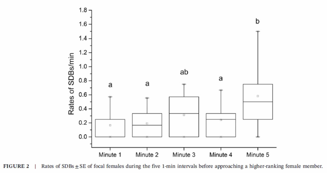 研究团队以位于黄山野生猴谷YA1群的野生藏酋猴为研究对象,通过记录和分析藏酋猴个体接近其他个体前(潜在风险事件)五分钟内的自我导向行为频次变化,分析社会等级和亲缘关系对个体靠近其他个体之前情绪的影响,发现(1)雌性和雄性在靠近高顺位同性个体之前均表现出较高的SDB频次;(2)雌性在靠近亲缘关系和非亲缘关系个体之前的SDB频次无显著差异;(3)雄性在靠近处于发情期雌性前也会表现出较高的SDB频次;(4)雌性在靠近较高顺位雌性个体的最后一分钟表现出最高的SDB频次。该研究表明在藏酋猴交往中,等级关系比亲缘关系更易导致潜在风险。藏酋猴的近距离交往前一分钟是个体最为紧张阶段。该研究历时一年半野外采样,通过革新数据记录和筛选方法,综合揭示了藏酋猴个体在靠近其他个体之前的情绪变化,为理解群居非人灵长类动物对社会关系认知具有重要参考价值。