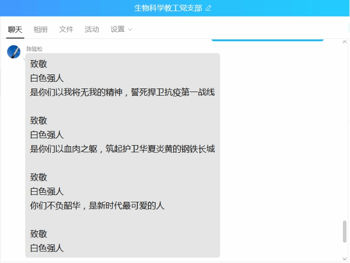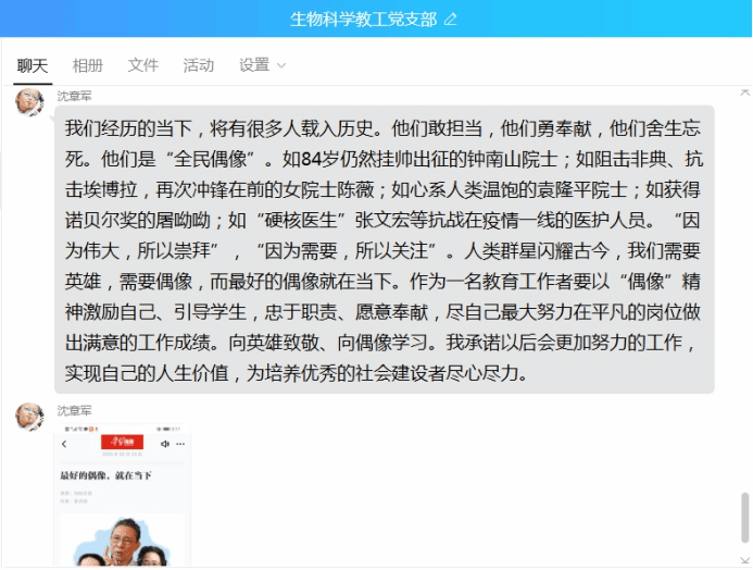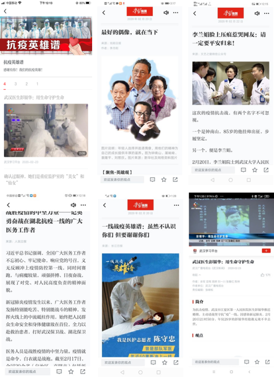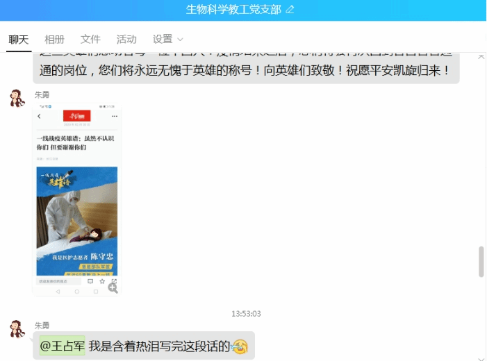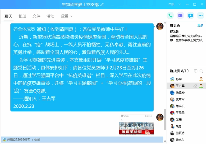 支部全体党员认真学习学习强国中的“抗疫英雄谱”,并积极分享了自己的学习心得:84岁仍然挂帅出征的钟南山院士,73岁力挽狂澜的李兰娟院士,冲锋在前的陈薇院士,武汉市武昌医院院长刘智明烈士,为抗击疫情推迟婚期的武汉市江夏区第一人民医院彭银华烈士,“硬核医生”复旦大学附属华山医院感染科主任张文宏医生,安徽医科大学附属巢湖医院ICU凌云护士长等一线的广大医务工作者们。
