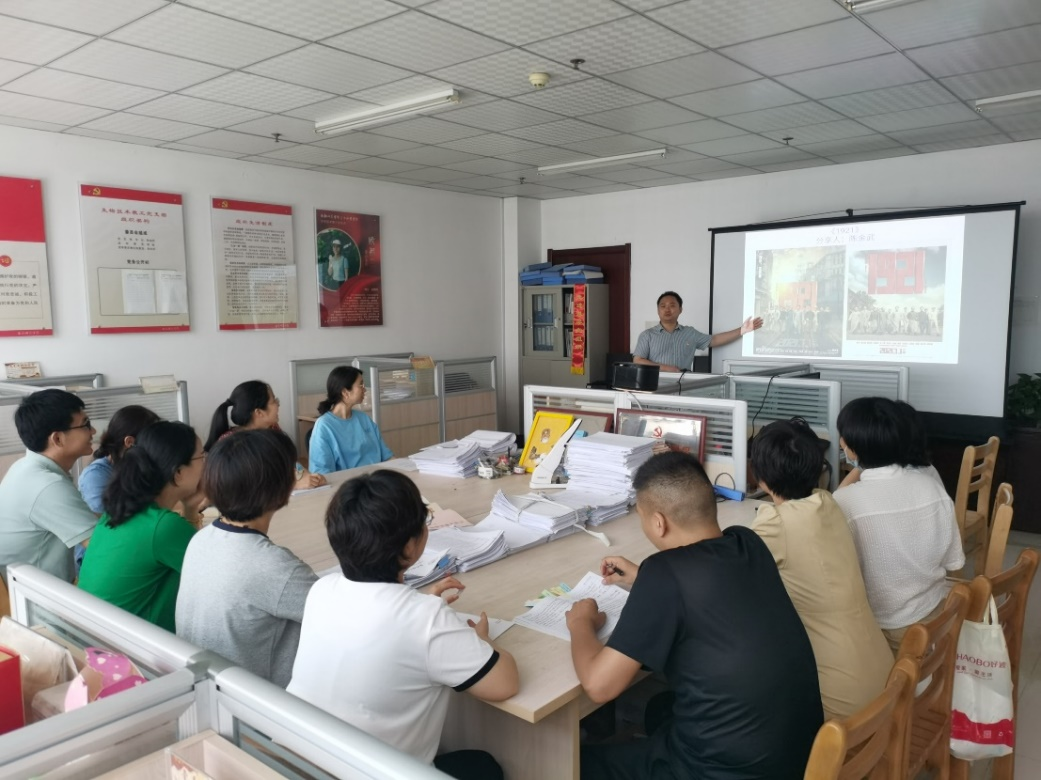 支部书记陈金武首先分享了《1921》。1921年对于中国来说是具有跨时代意义的一年。一群中国热血青年在南湖红船上做了一件惊天动地的大事——中共一大召开。中共一大的代表平均年龄只有28岁。作为首批中国共产党人,他们在风雨中承担起救国救民的重任,承担起救亡图存的重任,承担起点亮中国发展的重任。流血牺牲的中国共产党前辈们我们要铭记,中国革命历史我们要牢记。