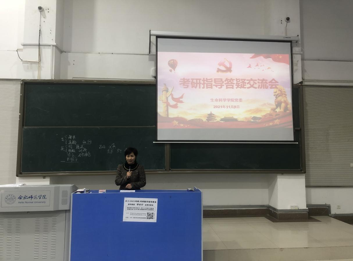 本网讯 为帮助毕业班考研学生解决实际问题,指导他们高效备战,缓解考前压力,提高成功率,进一步推动“为群众办实事”实践活动走深走实。11月8日中午,生命科学学院在逸夫楼西阶一教室开展毕业班考研指导答疑交流会。出席会议的有生命科学学院党委书记郭桃芬、副书记杨娜。指导答疑由教工党支部书记王占军、陈金武、方雪以及党员教师程诚、杨星星五位老师主讲。交流会由2018级辅导员杨帆主持,2018级一百余名学生参加。