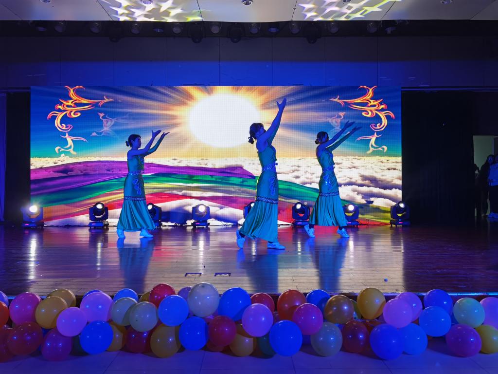 2021年是中国共产党建党100周年,历史的潮流用实力和真理告诉人们,中国共产党是人民心中最崇敬的党,节目《唱支山歌给党听》与朗诵《祖国颂》表达了同学们对中国共产党崇高的敬意和对祖国深厚的情感;一场灾难,让人疲惫不堪,但是在共产党的领导下中国人民紧紧相拥在一起,与病毒较量,小品《患难与共》再次重绘了抗疫期间的暖心故事;在白雪皑皑的天山脚下聚居着一个能歌善舞的民族,塔吉古丽·亚森和阿依谢姆古丽·努尔等同学献上的新疆舞蹈《麦西来普》和石明豪等同学演唱的《民族特色歌曲串烧》让我们身临其境,仿佛看到了他们在天山脚下生活的场景;而由赵晶晶和戚雨晨带来的相声《旅游记》用说学逗唱带我们又一次领略新疆的浩瀚沙海;十里画廊,雕梁绘栋绵延而去,廊畔河水幽碧,绿柳长堤,中国舞《牵丝戏》给观众以视觉上的冲击;节目《青瓷墨香》在书法中融入中西方乐器,传统与现代的碰撞,中西方文化的融合,更是别有一番风味在其中。晚会期间不仅有同学们的精彩表演,老师们也被作为嘉宾邀请上台演出。校团委姚瑶老师亢音高唱《这片海有我》点燃了现场的气氛;杨帆声情并茂演唱的《鸿雁》获得了同学们热烈的掌声和欢呼,歌曲结束后,杨帆带领少数民族同学一起为到场的领导老师们献上纯洁的哈达,以表达美好的祝愿。李万成与杨帆合作弹唱的《外面的世界很精彩》更是感染观众们一同参与其中;晚会在大合唱《爱我中华》的精彩演唱中完美落幕。舞台上的演出精美绝伦,舞台下挥舞着国旗的老师和同学们更是热情高涨。