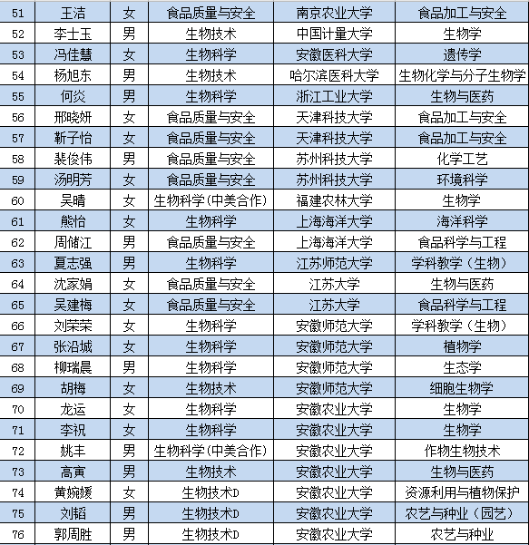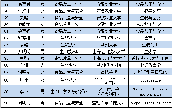 331名毕业生中有90名被国内外高校录取,国内升学87名,国外升学3名,总体录取率达27.2%,其中考取“985”、“211”高校51人,占比57%,9名毕业生报考中国科学技术大学全部被录取,其中生物科学专业方茜同学斩获中科大生物学专业综合成绩第一名。另外还有李芹、任林、孔海燕3名同学分别斩获南京大学生物与医药专业第一名、合肥工业大学生物与医药专业第一名、兰州大学细胞生物学专业第一名。在考取研究生的同学中,统招生(不含对口招生和中美合作专业)考研率达37%,再创生命科学学院历史新高。首届对口招生的生物技术毕业生96人,考取研究生7人,其中3人为“211”建设高校,成绩亦是喜人。