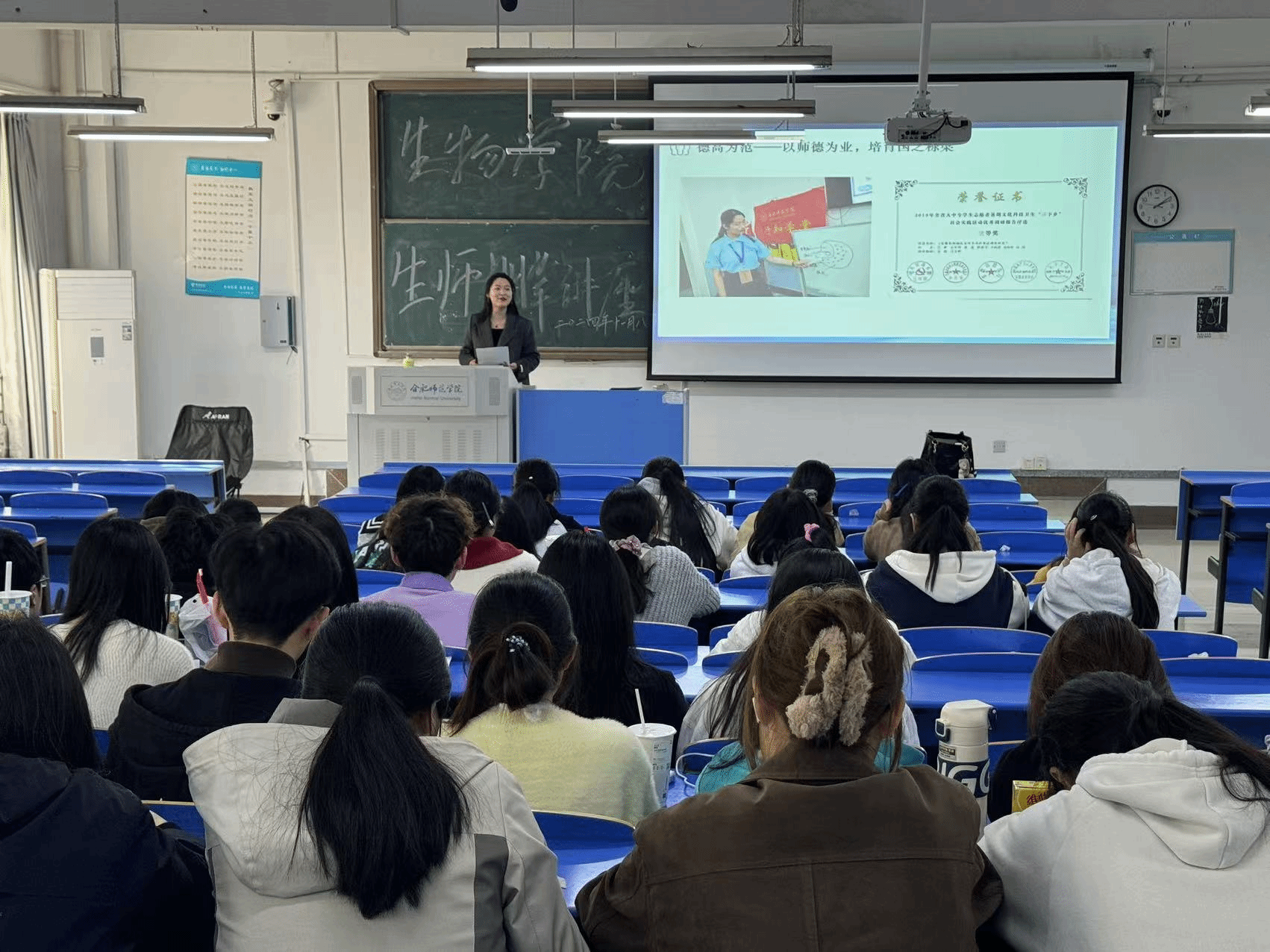 辛淑静围绕夯实专业基础、锤炼师范技能、提升文化涵养等三个层面讲述了自身从“生物师范生”蜕变到“高中生物教师”的历程。她指出自我约束、自我修养、自我完善是实现这一蜕变的“三大法宝”。只有不断地学习和完善,才能在时代的浪潮中把握机会,迎接挑战。随后,她针对教师考编策略、面试礼仪、心理调适等方面与学弟学妹进行互动交流。整场讲座的氛围积极活跃,同学们纷纷表示受益匪浅。