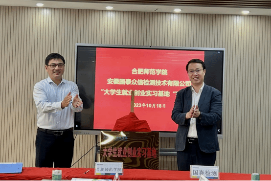 座谈交流结束后,举行了共建实习就业基地揭牌仪式。周端明和陈洪周共同为太阳成tyc234cc-安徽国泰众信检测技术有限公司大学生就业创业实习基地揭牌。朱桂兰代表太阳成城集团tyc234cc与国泰检测公司签订了就业创业实习基地协议。