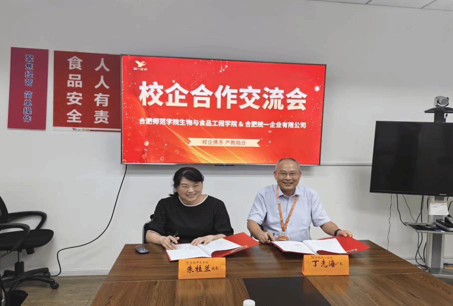 此次访企,受到了合肥统一有限公司厂长丁先海、生产部经理侯振宁等人的热情接待。双方进行了深入的座谈交流,就企业发展现状、人才需求以及学院专业设置、课程安排、学生实习就业以及发展等方面进行了全面的探讨交流。现场双方顺利签订了就业实习合作协议,并举行了共建大学生就业实习基地授牌仪式,为毕业生搭建更加广阔的实习就业平台。
