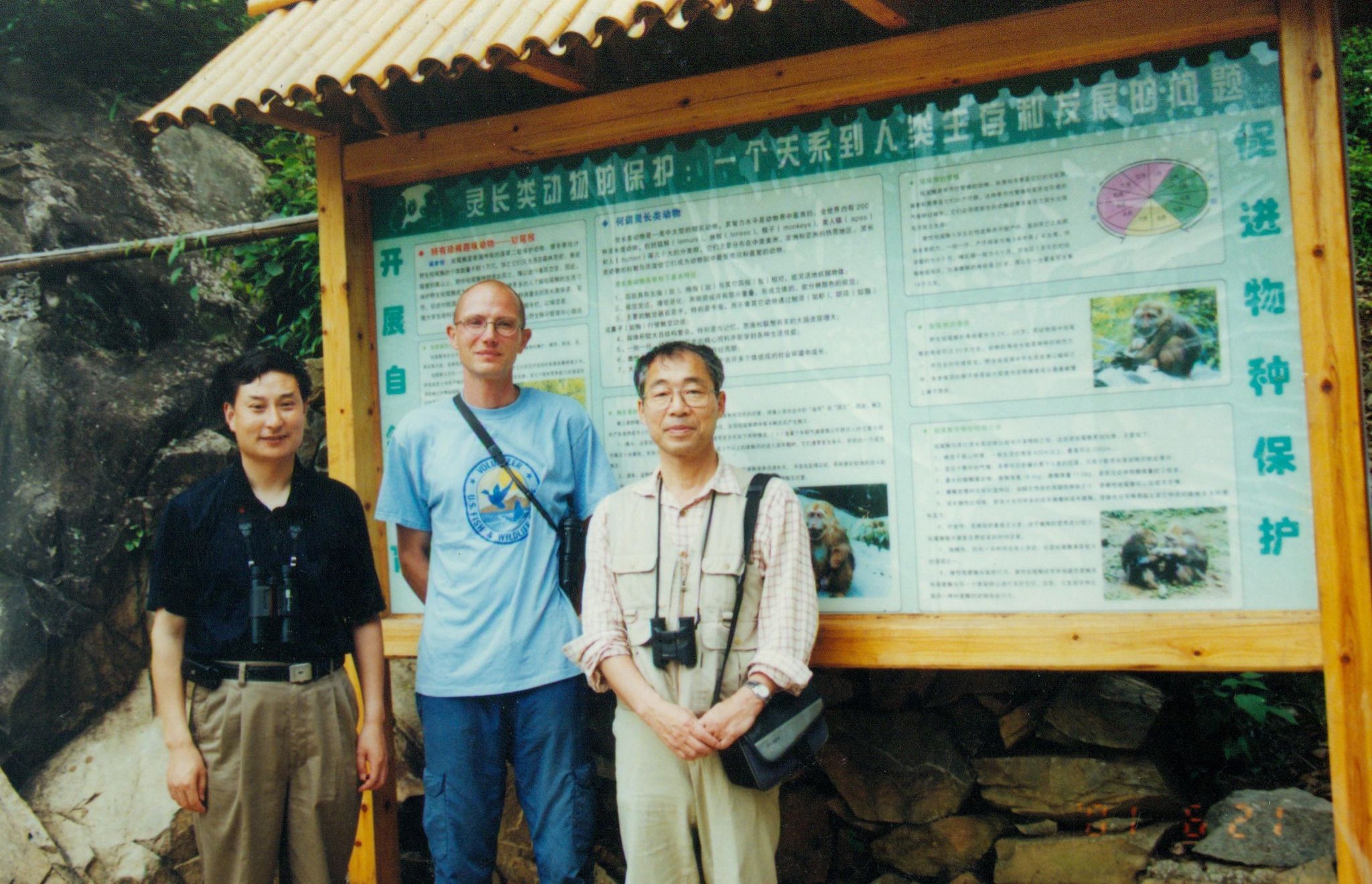李进华(左一)与国际灵长类学会前主席西田利贝教授(中)在黄山短尾猴野外研究基地合影